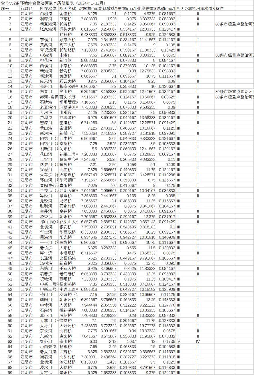 全市69條環境綜合整治河道水質明細表(2024年1-12月)