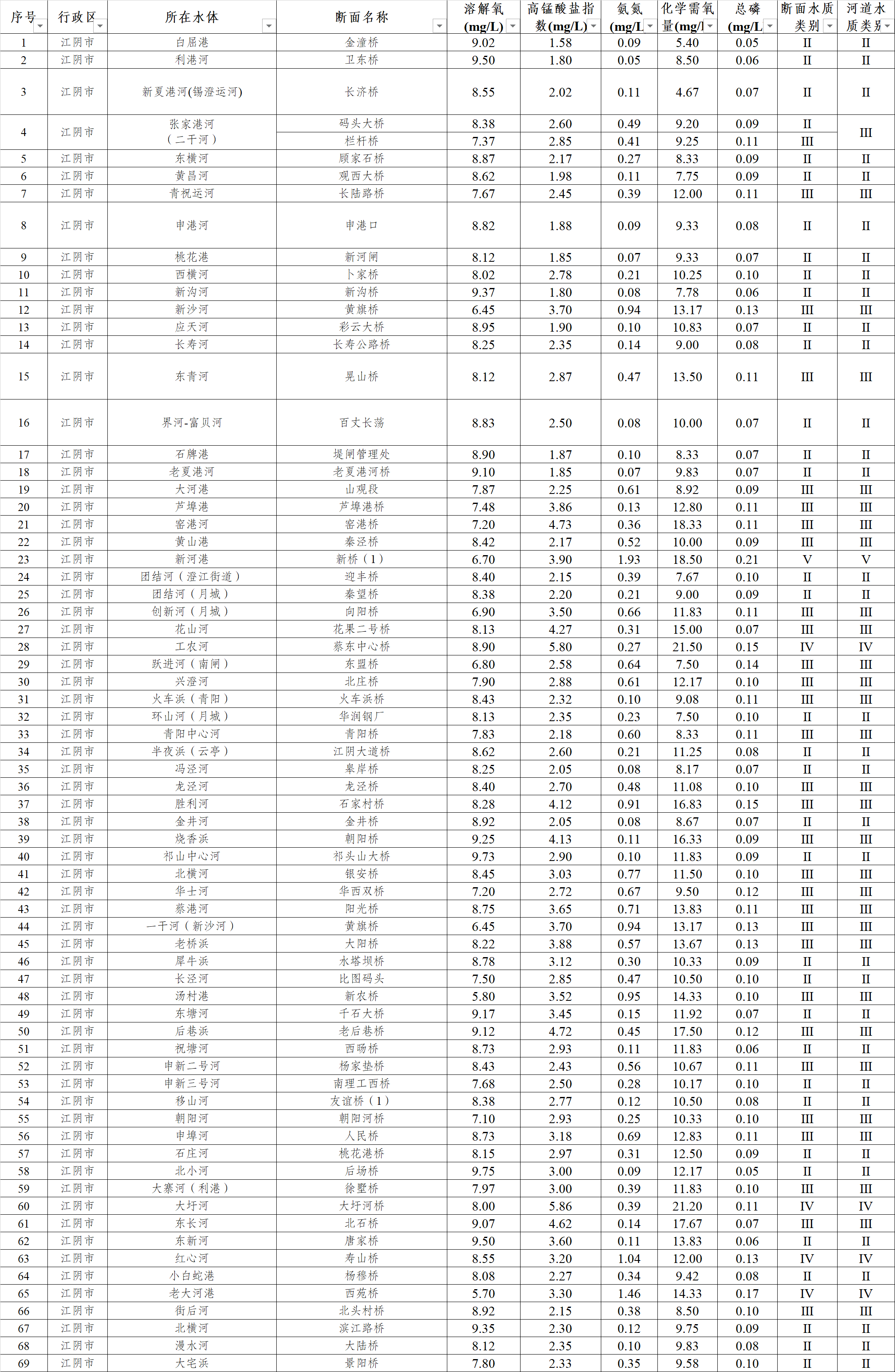全市69條環境綜合整治河道水質明細表(2025年1-6月)