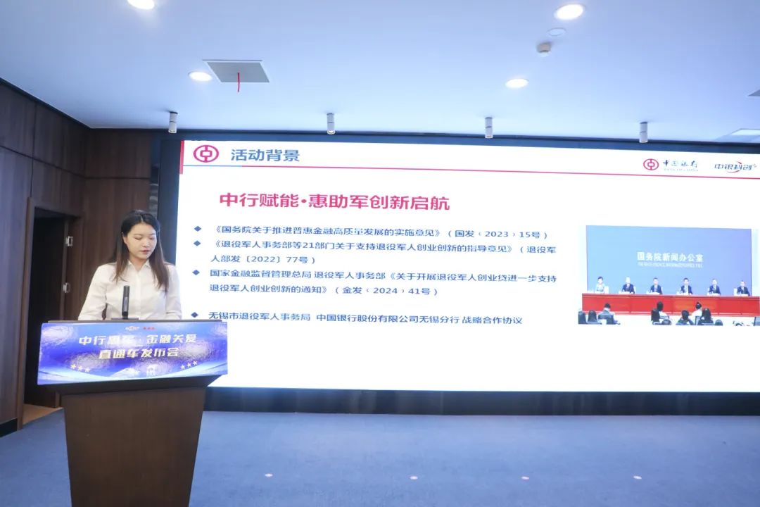 無錫市退役軍人事務(wù)局副局長張赟為中行首批“退役軍人金融服務(wù)專員”頒發(fā)聘書。