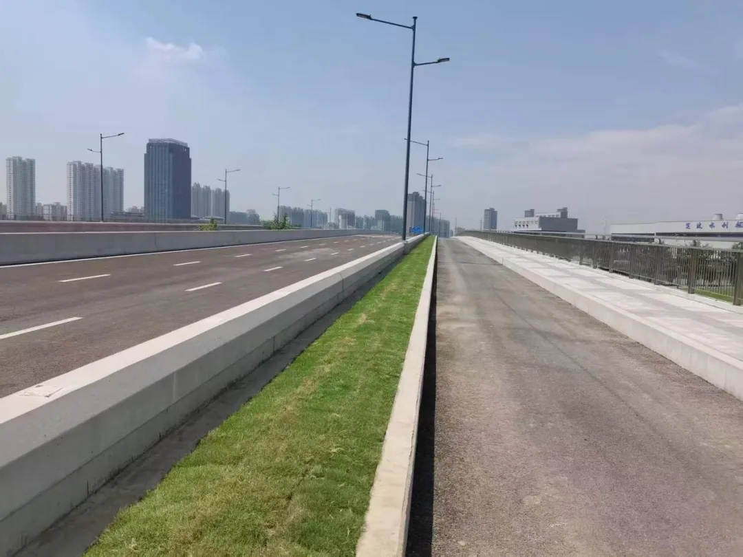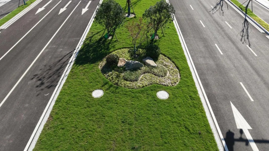 值得一提的是,項目在文富路—通江路段中央分隔帶位置創新采用明渠、箱涵與管涵相結合的形式,對原江鋒中心河進行改造。這一設計既完善了區域防洪排澇體系,提升了水環境質量,又實現了土地集約化利用,體現了工程建設與生態保護的和諧統一。