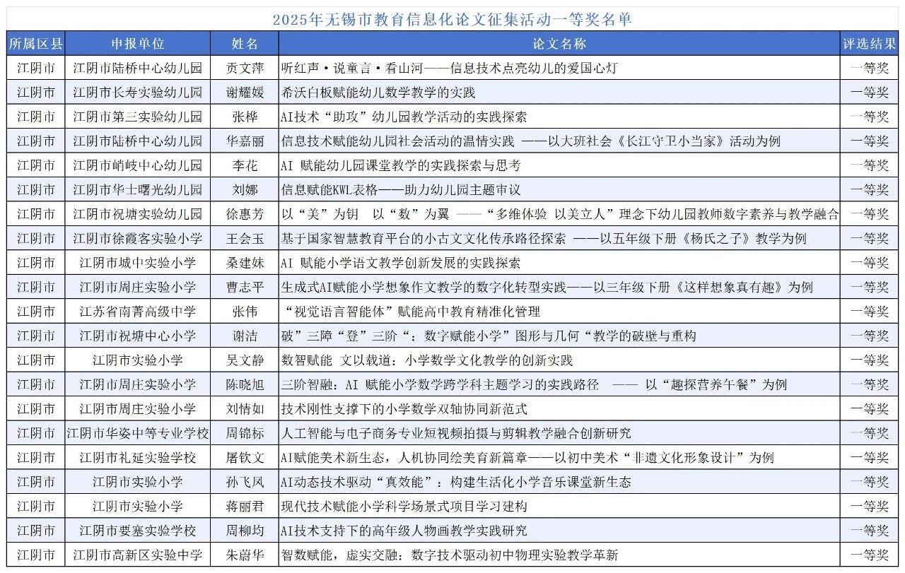 近日,2025年無錫市教育信息化論文征集活動獲獎名單公布。江陰市以總數(shù)100篇獲獎的優(yōu)異成績脫穎而出,獲獎篇數(shù)位居無錫全市前列,其中一等獎21篇、二等獎29篇、三等獎50篇,多篇論文被選送參加省級論文征集活動。江陰市教育信息化和裝備管理服務中心榮獲優(yōu)秀組織獎,充分彰顯了江陰教師在教育信息化研究與實踐領(lǐng)域的深厚底蘊與創(chuàng)新活力。