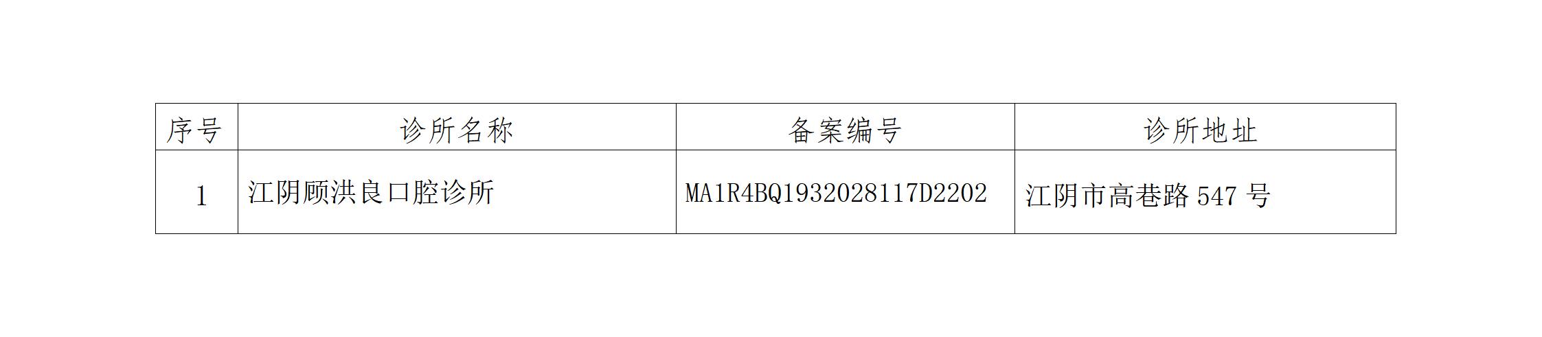 根據《診所備案管理暫行辦法》第十九條的規定,經審查,江陰顧洪良口腔診所已歇業,現擬對其《診所備案憑證》予以撤銷。公示如下: