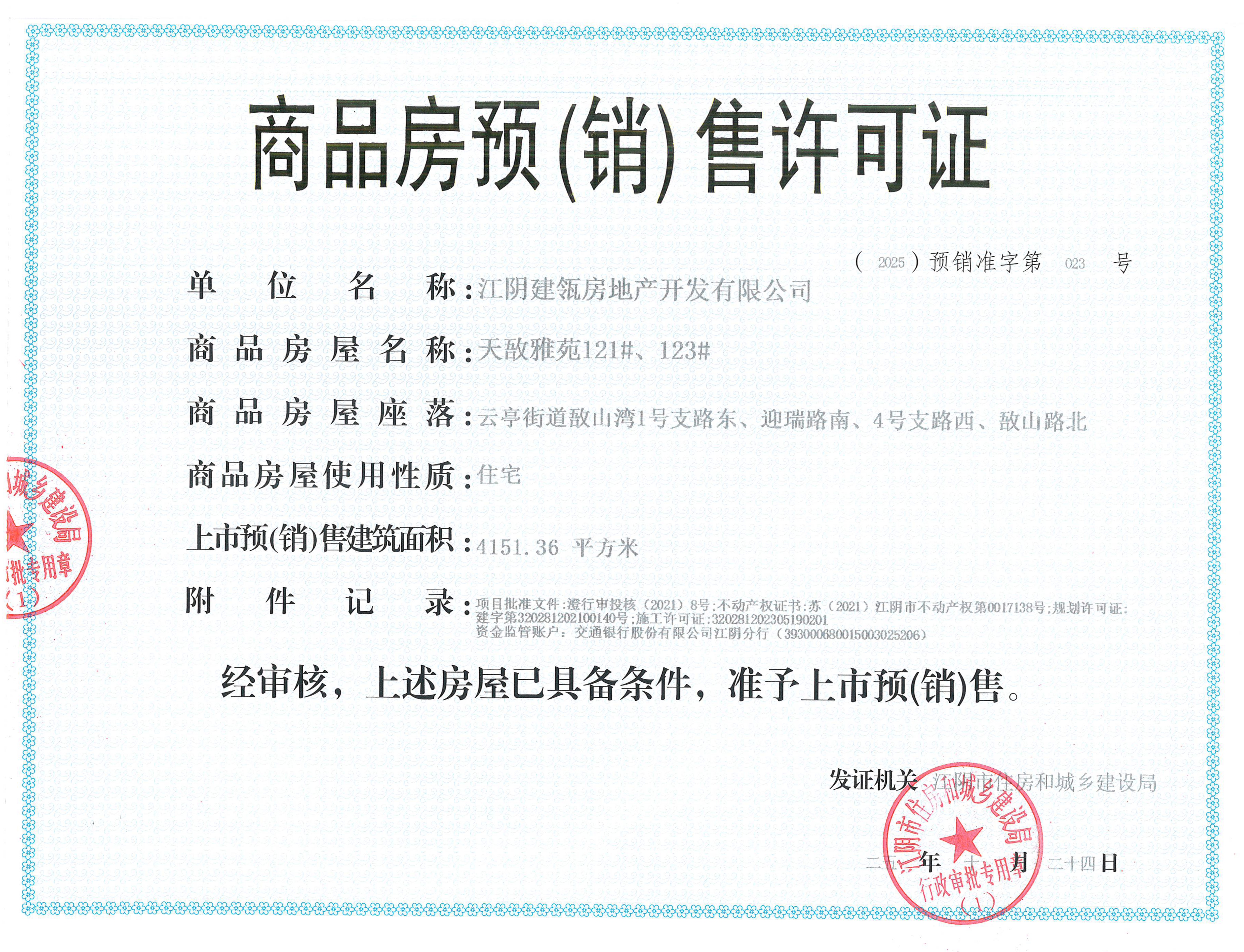 商品房預(銷)售許可證(天敔雅苑121#、123#)