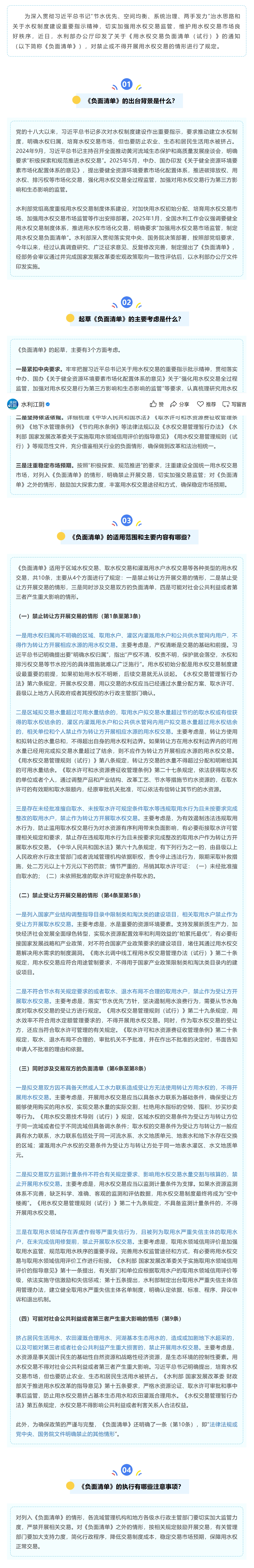 | 內容概述 | 為深入貫徹習近平總書記“節水優先、空間均衡、系統治理、兩手發力”治水思路和關于水權制度建設重要指示精神,切實加強用水權交易監管,維護用水權交易市場良好秩序,近日,水利部辦公廳印發了關于《用水權交易負面清單(試行)》的通知(以下簡稱《負面清單》),對禁止或不得開展用水權交易的情形進行了規定。 | ||||