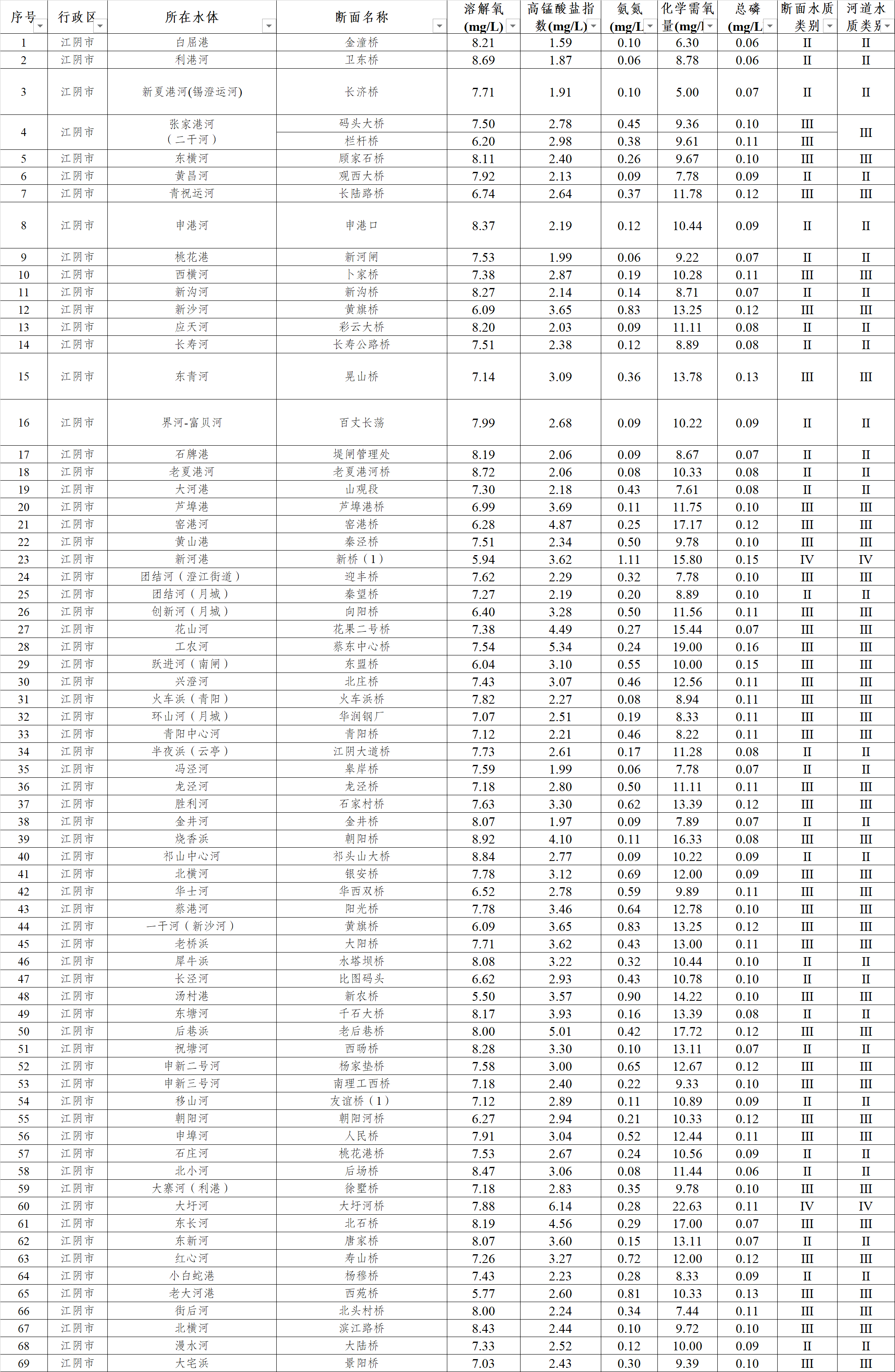 全市69條環境綜合整治河道水質明細表(2025年1-9月)