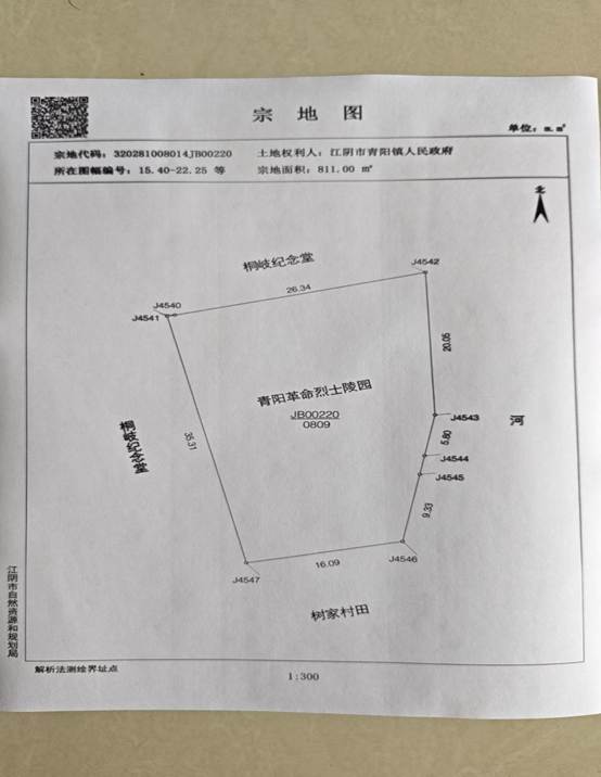 以青陽革命烈士陵園宗地圖(宗地代碼:320281008014JB00220,所在圖幅號:15.40-22.25等)為參照,具體保護范圍確定以烈士紀念碑為基準,西至桐岐紀念堂墓地通道,北至桐岐紀念堂消防河道,東至桐岐紀念堂消防河道,南至樹家村田區域。