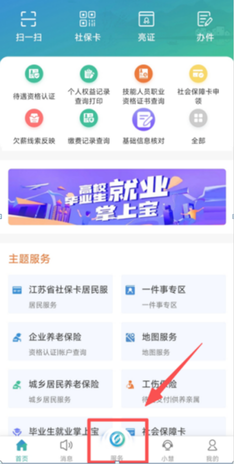第一步:登錄“江蘇智慧人社”APP或小程序,點擊“服務”選項。