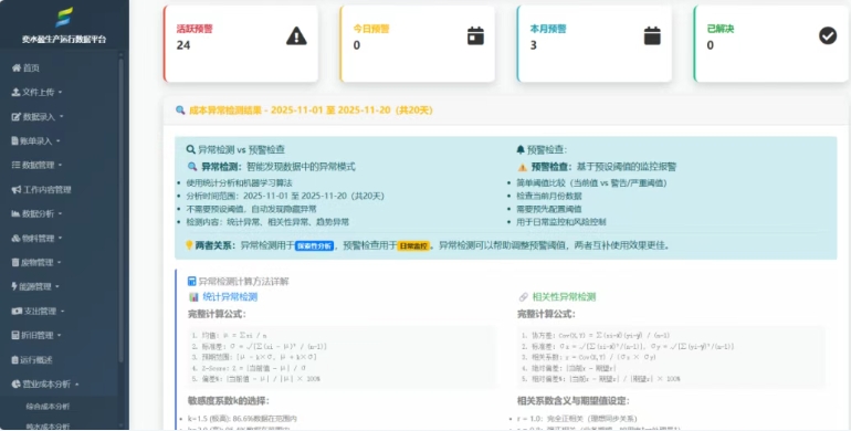 為強(qiáng)化“近零排放”管控,公司技術(shù)部自主研發(fā)“奕水盈污水處理管理系統(tǒng)”。該系統(tǒng)以Python+Flask架構(gòu)本地化部署,實(shí)現(xiàn)全流程數(shù)據(jù)實(shí)時(shí)采集與智能分析。其四大核心功能精準(zhǔn)賦能:自動(dòng)化報(bào)表與趨勢(shì)圖生成解放人力,節(jié)省工時(shí)聚焦工藝優(yōu)化;“雙口徑核算”切換廠內(nèi)水表流量與園區(qū)客戶水表流量的噸水成本算法;動(dòng)態(tài)預(yù)警及時(shí)排查每日成本異常,規(guī)避水質(zhì)波動(dòng);多維度分析優(yōu)化能耗、物料庫存。系統(tǒng)使運(yùn)營效率提升20%以上,筑牢數(shù)字化管控根基。